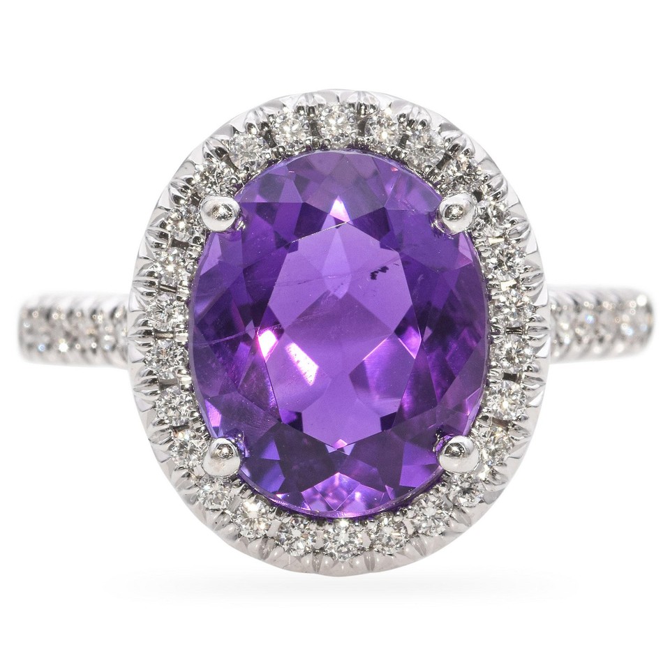 Anillo Estate de oro blanco de 14k amatista con halo de diamantes-