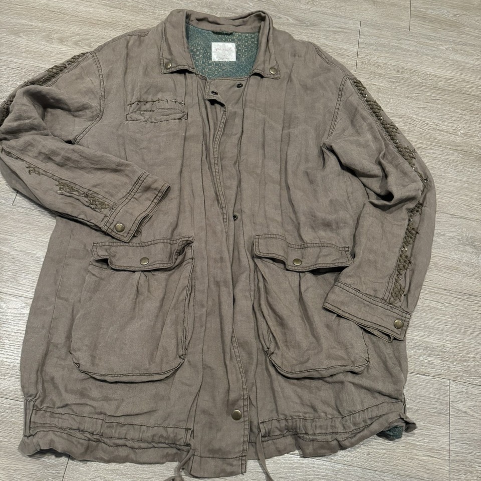 Chaqueta de sarga bordada resistente Free People FrenchOlive para mujer L 100 % lino utilitaria-