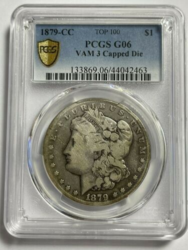 Dólar de plata Morgan 1879-CC, PCGS en muy buen estado 06, top 100 VAM 3 troquel con tapa, herradura de oro.-