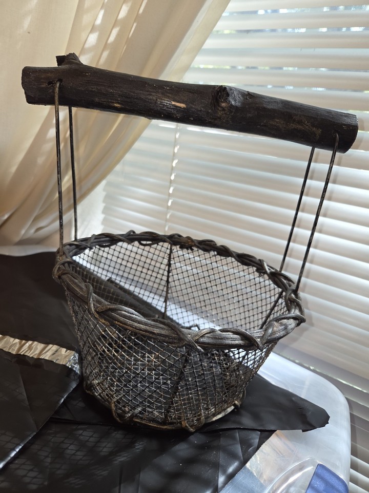 Cesta de huevos de pollo de alambre de metal vintage mango de madera redondo rústico rural -