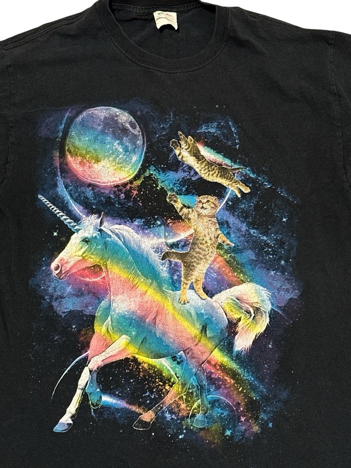 Camiseta Cats Riding Rainbow Unicorn In Space Psicodélica Fruta del Telar Talla M-
