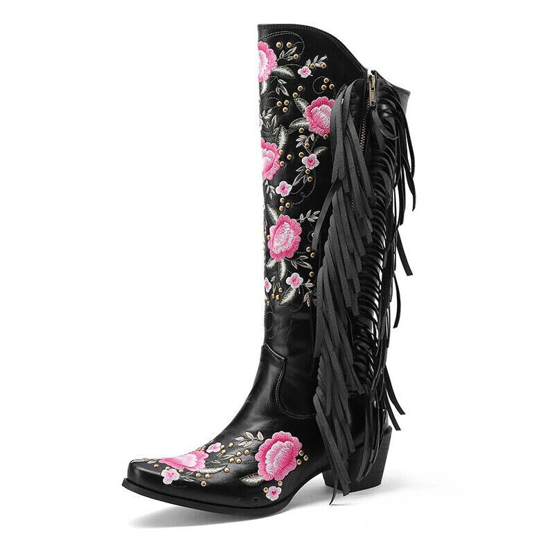 Botas de Vaquero para Mujer Vaquera Western Medio Bloque Hasta la Rodilla Flecos Bordados Botas-