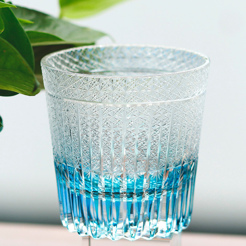 Vaso de vidrio de whisky Edo Kiriko estilo japonés cortado a mano para limpiar 11 oz azul cielo-