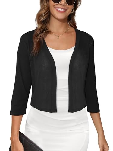Mujer Manga 3/4 Delgado Encogimiento de hombros Ligero Frente Abierto Recortado Grande C01-negro-
