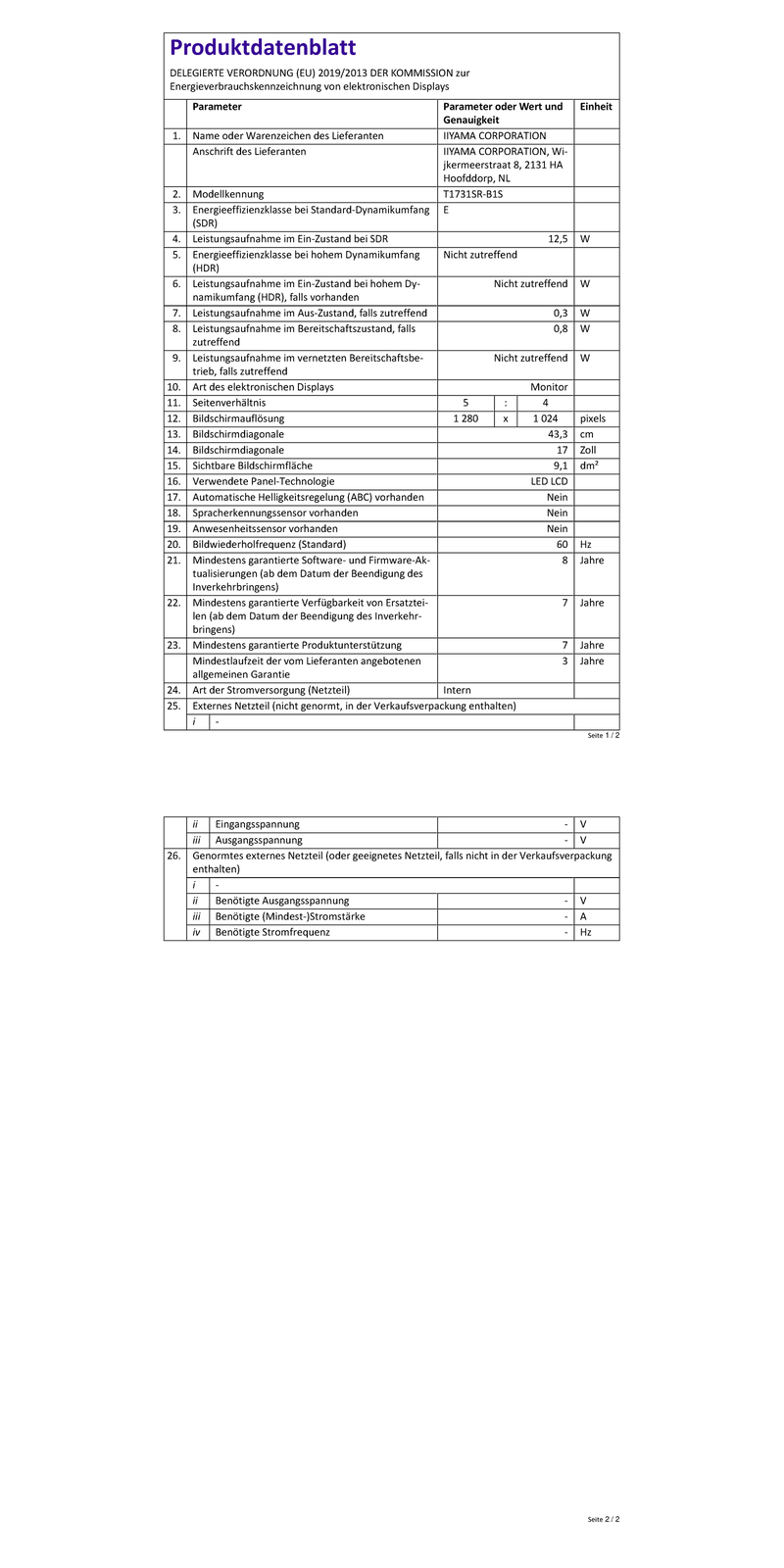 IIYAMA 43.0cm (17") T1731SR-B1S 5:4 HDMI+DP Spk Negro Retail