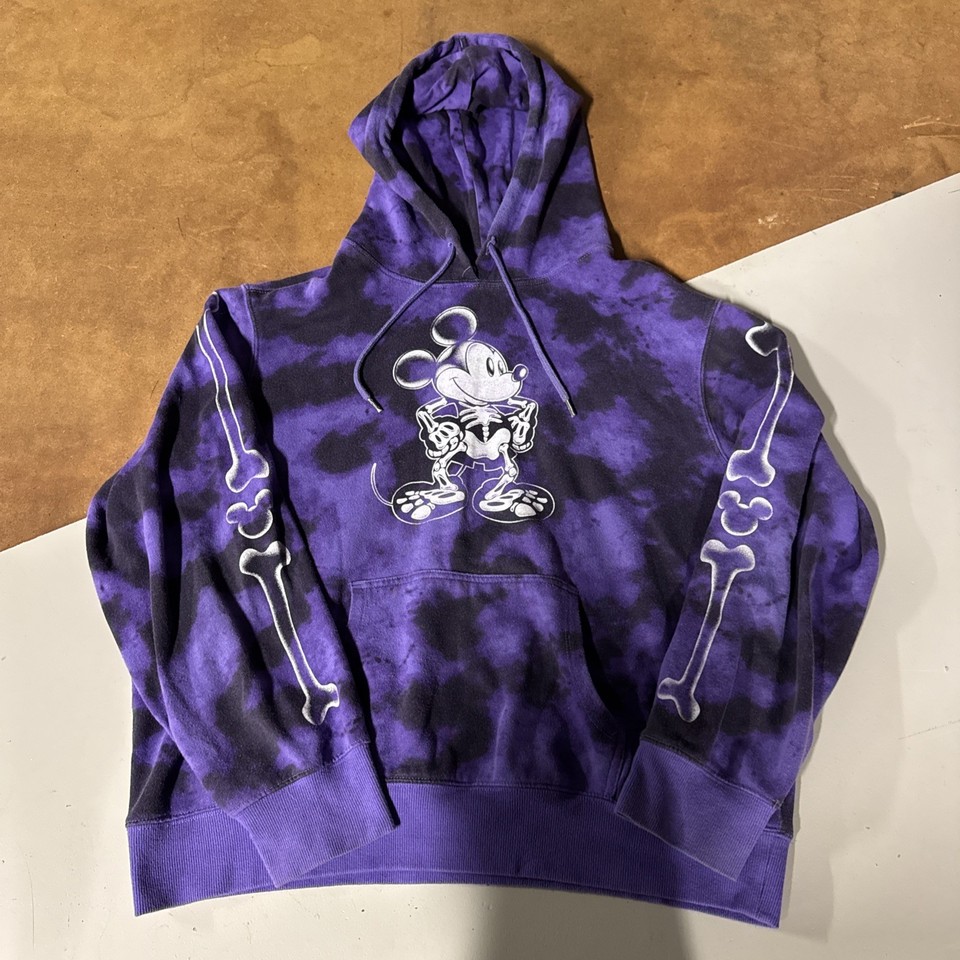 SUDADERA CON CAPUCHA TIE DYE PÚRPURA ESQUELETO MICKEY MOUSE PARQUES DE DISNEY TALLA M CORDÓN -