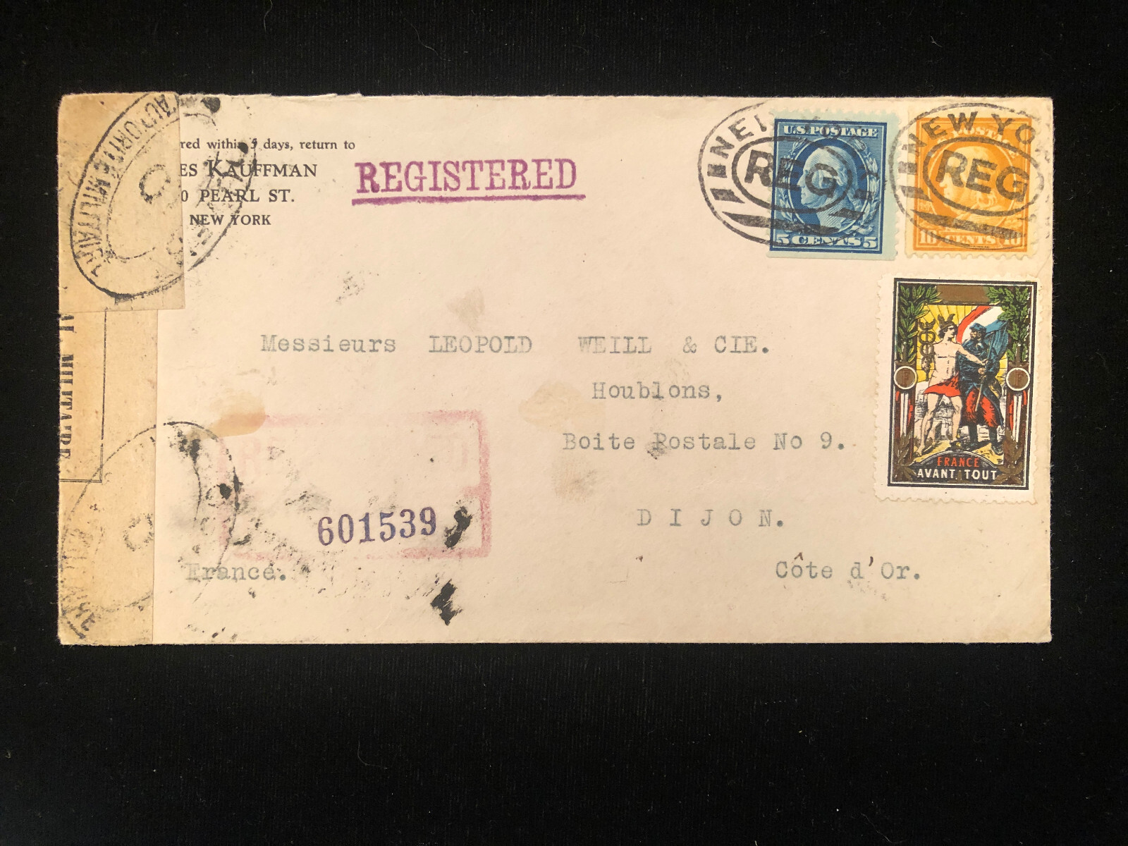 NY NUEVA YORK 1917 CUBIERTA REGISTRADA 10¢ FRANKLIN, 5¢ WASHINGTON A FRANCIA CENSURADA-