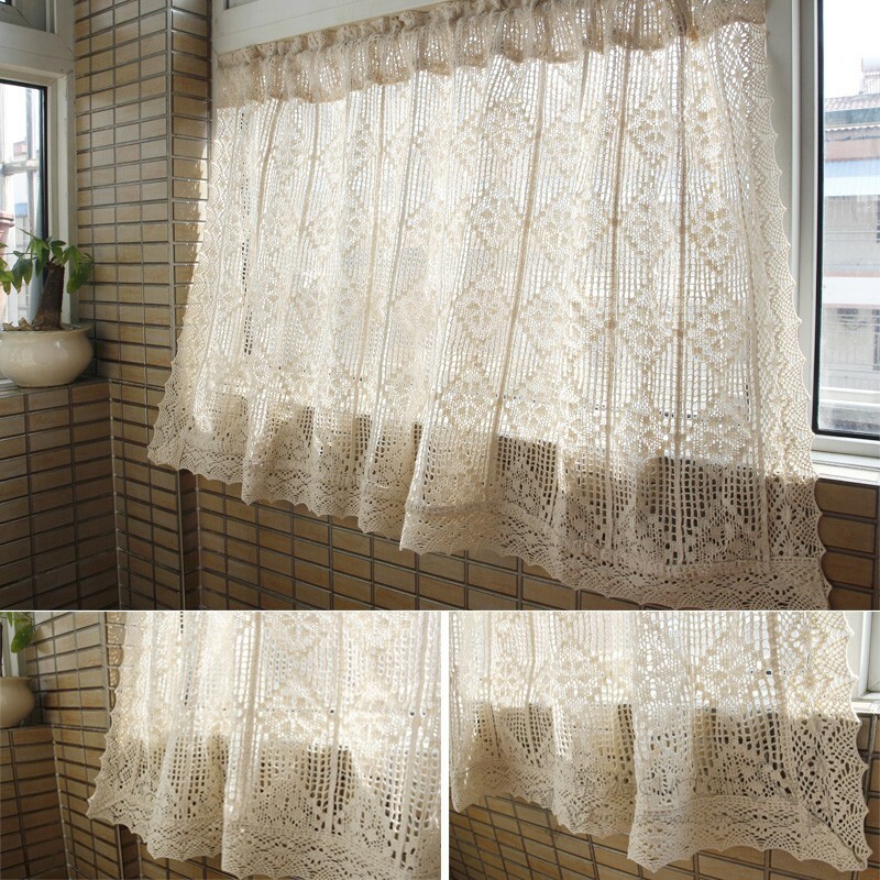 Cortina de encaje de ganchillo francés hilo de algodón panel hueco de colección beige-