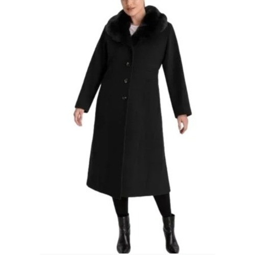 Abrigo Anne Klein para mujer negro mezcla de lana imitación piel cuello botón delantero 3X-