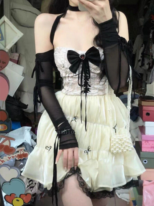 Mini Vestido Kawaii Lolita Mujer Corto Vestido de Fiesta Encaje Vintage Elegante Vestido-