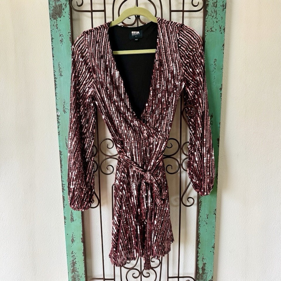 Bardot Women's Pink Sequin Stripe Long-Sleeve Faux Wrap Mini Dress Size XS