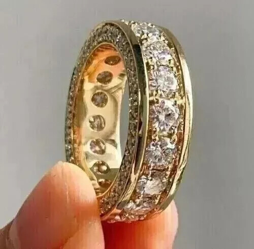 Alianza de boda de eternidad de moissanita real de corte redondo de 2,00 quilates chapada en oro amarillo de 14 quilates-