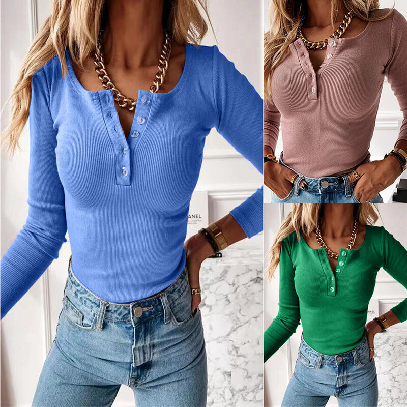 Camiseta básica para mujer Camiseta suave tejida de algodón ajustada manga completa cuello en V Prendas para el torso liso-