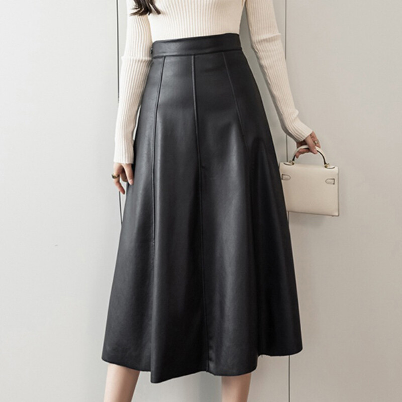 Dama Informal Falda Midi PU Imitación Cuero Columpio Cintura Alta Cremallera Plisada Línea A -