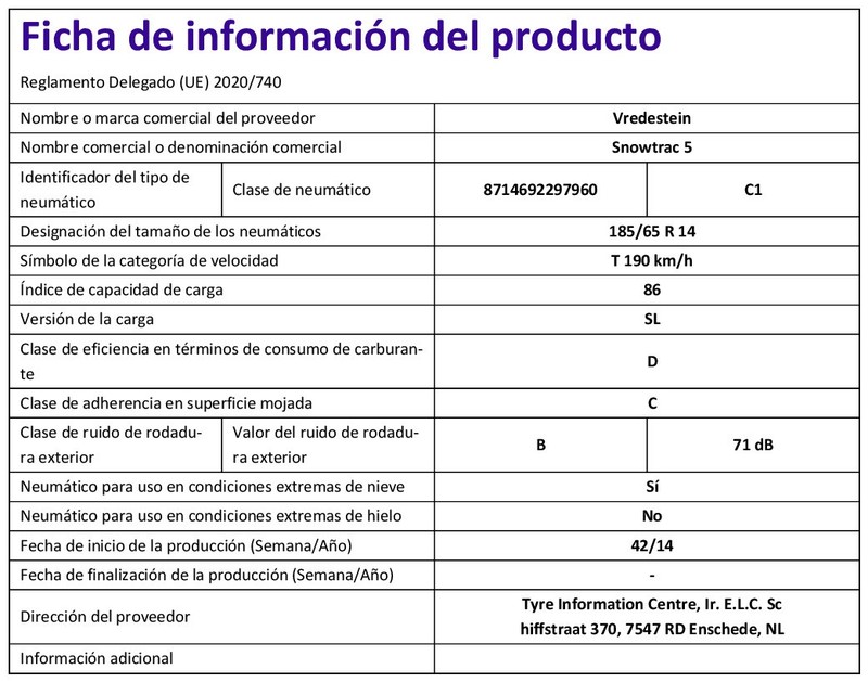185/65 R14 86T Neumáticos de Invierno VREDESTEIN Snowtrac 5 Auto