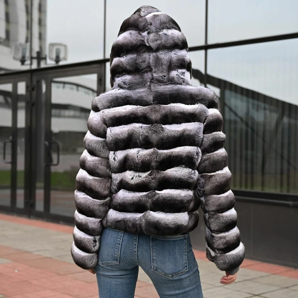 2025 Mujer Piel de Conejo Rex Real Capucha Abrigo Invierno Chinchilla Chaqueta Corta-
