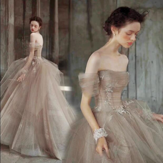 Mujeres Hermoso Fuera del Hombro Tul Línea A Princesa Vestidos Banquete Baile de graduación Vestido Lo último-