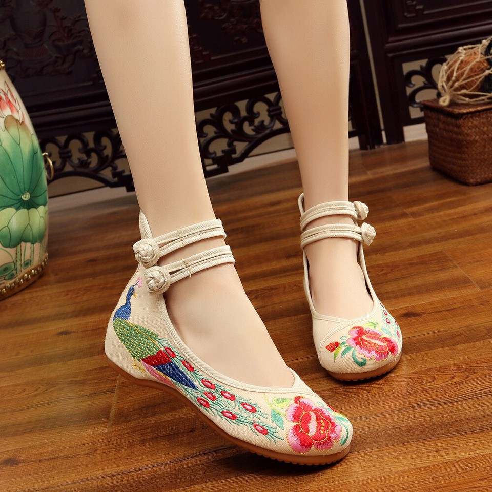 Mujeres Zapatos Bordados Estilo Floral Chino Cuña Planos Ballet Danza Correa al Tobillo-