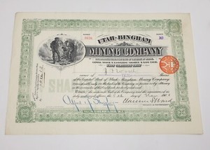 Antiguo certificado Utah-Bingham Mining Company 10 acciones número 8635