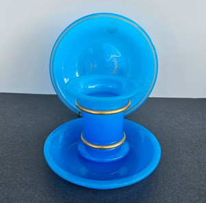 Jarrón y platos antiguos de vidrio opalino azul francés del siglo XIX
