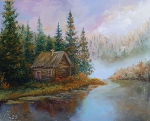 Cuadro "A orillas del río". Óleo sobre tablero duro. 8x10 pulgadas. Hecho a mano. 2025.