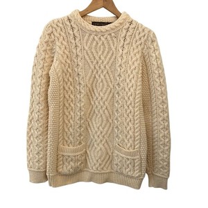 Pullover Inis Crafts Crema 100% Lana Merino Tejido con Cable Suéter Bolsillos Talla M