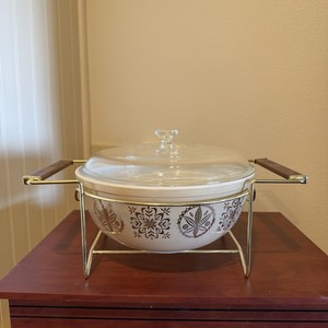 Vintage Pyrex Bowl 1960 promocional letreros hexagonales 404 bronceados 4 cuartos de galón estante de alambre + tapa