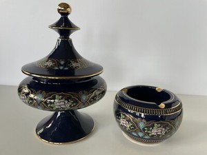 Plato de caramelo y cenicero de porcelana con tapa floral azul cobalto y dorado Florencia Italia 26,03 EUR