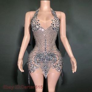 Women Rhinestones Sexy Halter Backless Mesh Short Dress Performance Stage Wear