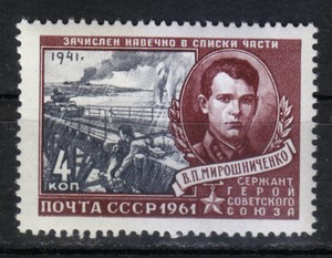 Rusia 1961 MNH Mi 2458 Sc 2449 Soldado héroe de la Segunda Guerra Mundial. Miroshnitchenko ** 1,12 EUR