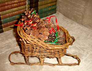 Cesta trineo vintage de mimbre sauce vid con piñas de 10,5" de largo granja