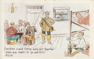 Postal de colección humor cómic hombre pesca, todo muerde por aquí pero peces!