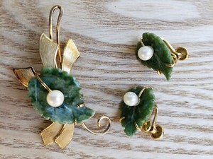 Prendedor de hojas de plata Art Deco cabujón moteado vidrio pekín verde de colección - broche
