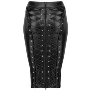 Falda de cuero PU cremallera vendaje imitación cuero encaje trasero mujeres damas rodilla mojada