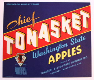 Original raro CHIEF TONASKET etiqueta de caja de manzana Tonasket Ellis-Forde Growers Wash