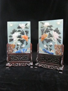 Mesa de té de piedra dura de jade china pájaro y flor en par de soportes de madera tallada