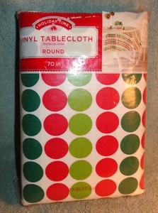 NEW IN PACKAGE HOLIDAY TIME CHRISTMAS ROUND VINYL TABLECLOTH 70" MULTI- DOTS
