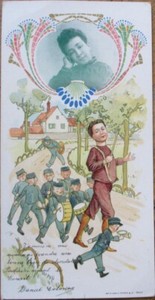 French 1890 Die Cut Trade Card, Soldier Cat Woman, Chocolate Chocolat Cida