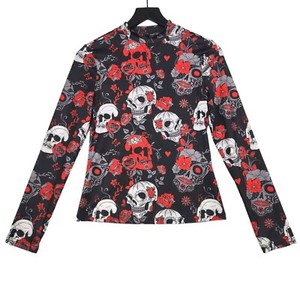 Top SHEIN Juniors Talla Mediana Manga Larga Gótico Calaveras Rosas Bruja Halloween