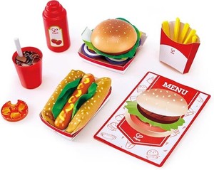 Juego de comida rápida Hape de madera para comedor de comida rápida juego de juguetes clásico americano
