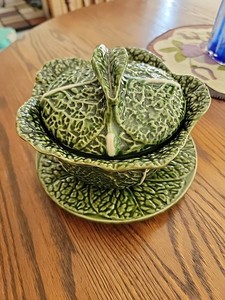 Hermoso plato de verduras vintage de mayólica con forma de repollo verde de 3 piezas - BONITO