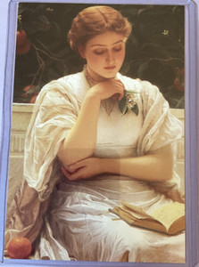 Niña leyendo sosteniendo una lila frente a un naranjo postal, parte posterior dividida