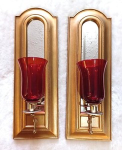 JUEGO VINTAGE 2 VELAS DORADAS APLIQUE PARED ESPEJO HOLLYWOOD REGENCY ROJO VOLTIVE MCM