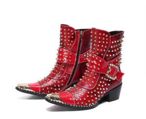 Rivets Mens Metal Pointed Toe Ankle Boots Block Heels Real Leather Shoes Stage