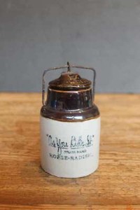 Antigua jarra publicitaria de gres miniatura "como quieras" rábano picante