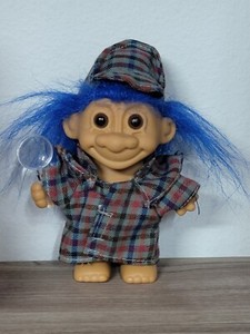 Muñeca Russ Troll Detective Sherlock Holmes 5" Pelo Azul Con Vidrio Magnefying De Colección