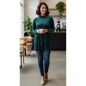 Top cuello falso floral Burnout de terciopelo suave envolvente manga larga verde talla XL