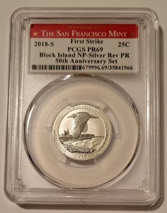 PCGS 2018 S Silver Block Island cuarto prueba inversa PR69 FS SF etiqueta como nueva (B)
