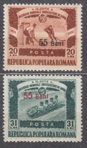 ROMANIA 1952 SC#847/48 MNH** 55b on ... pair, Winter Games, Surch. New Value.