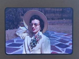 De colección 1950 Kodachrome 35mm Diapositiva Mujer en Sombrero y Gafas Exterior Retrato